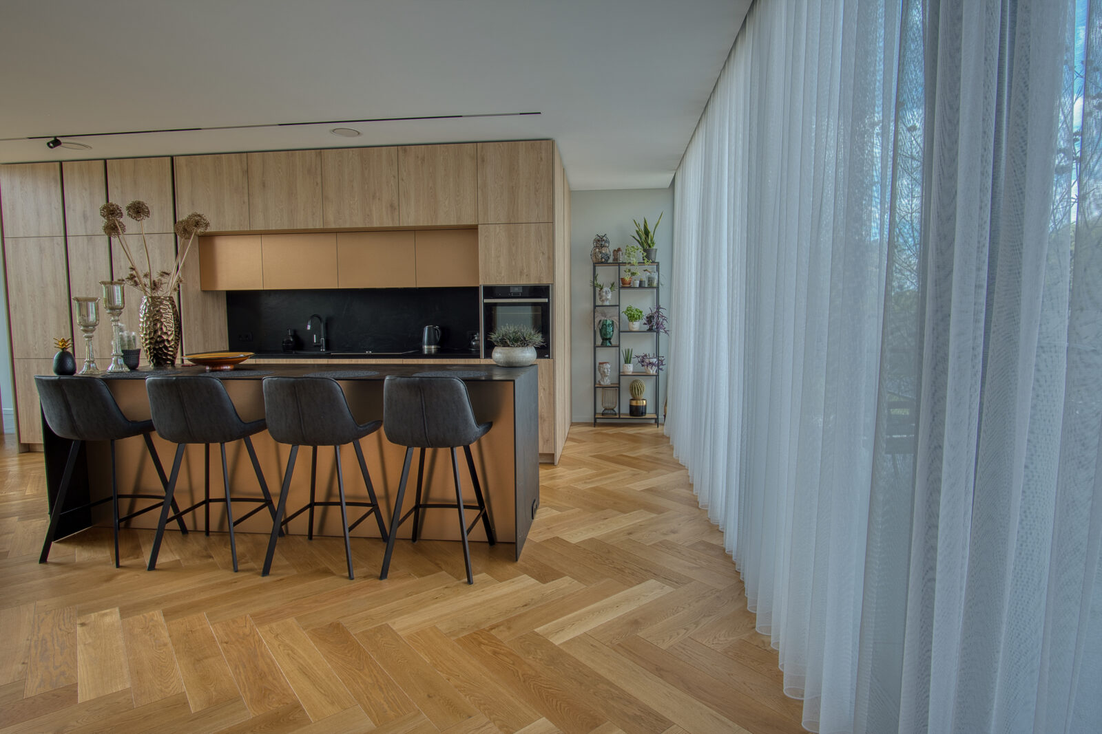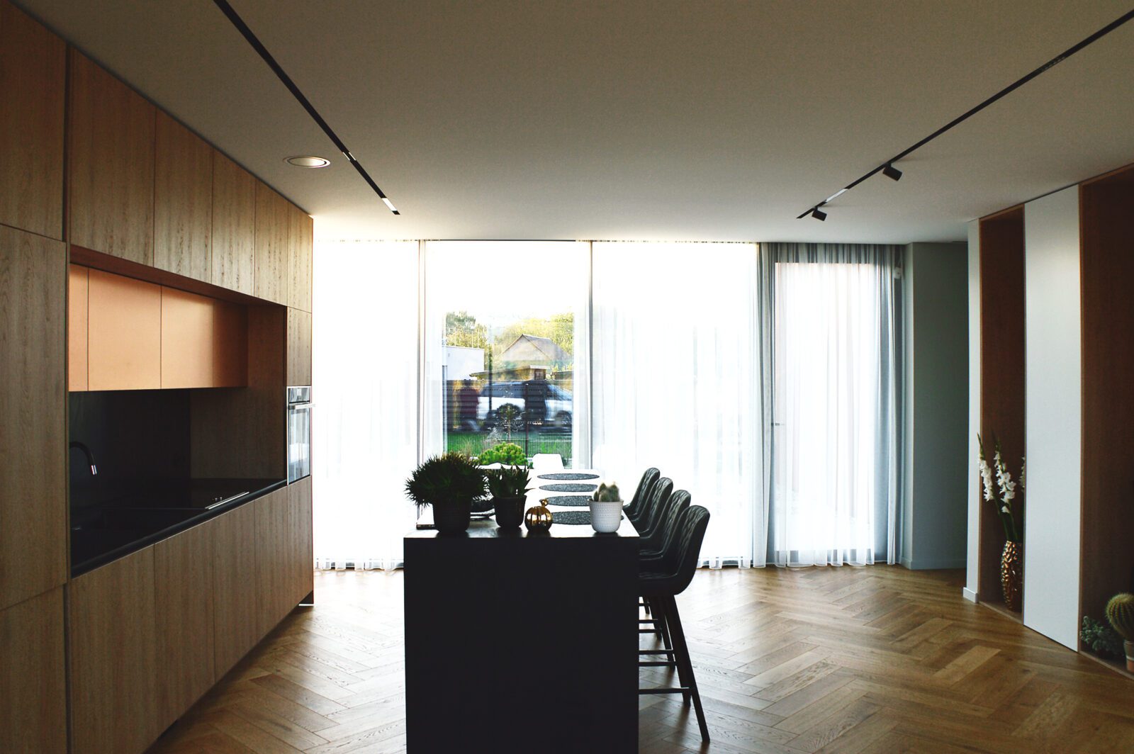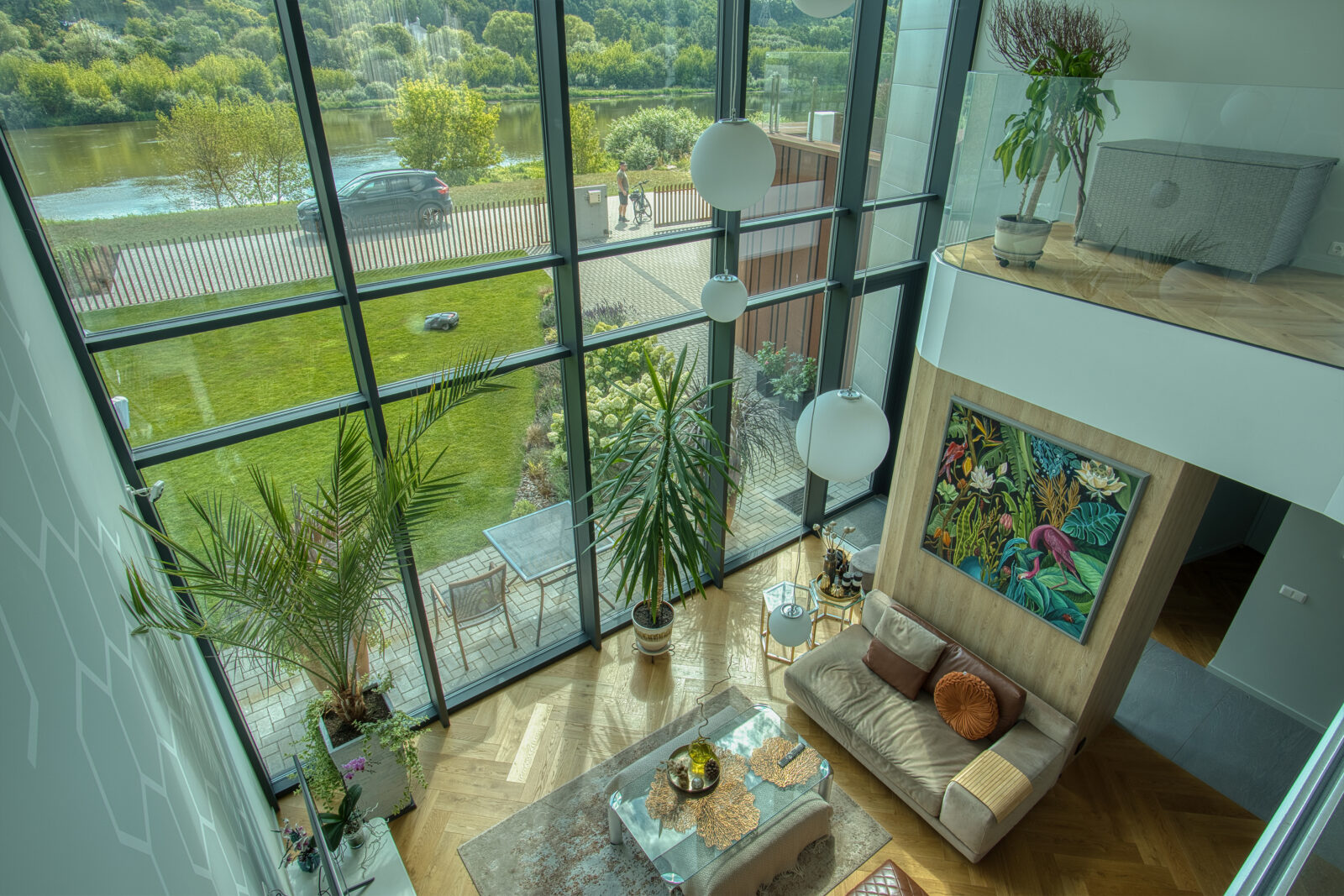 The individual house interior offers breathtaking views of the river, creating a serene and picturesque atmosphere. The double height spaces add a touch of grandeur and openness to the entire house. The abundance of plants throughout the interior enhances the overall aesthetic, bringing nature indoors and creating a fresh and vibrant ambiance. The combination of the stunning river view, the spacious double height areas, and the lush greenery creates a unique and inviting living space that is both tranquil and refreshing. Whether relaxing in the living room, cooking in the kitchen, or unwinding in the bedroom, the beauty of the surroundings is always present, making this house a truly special and idyllic retreat.