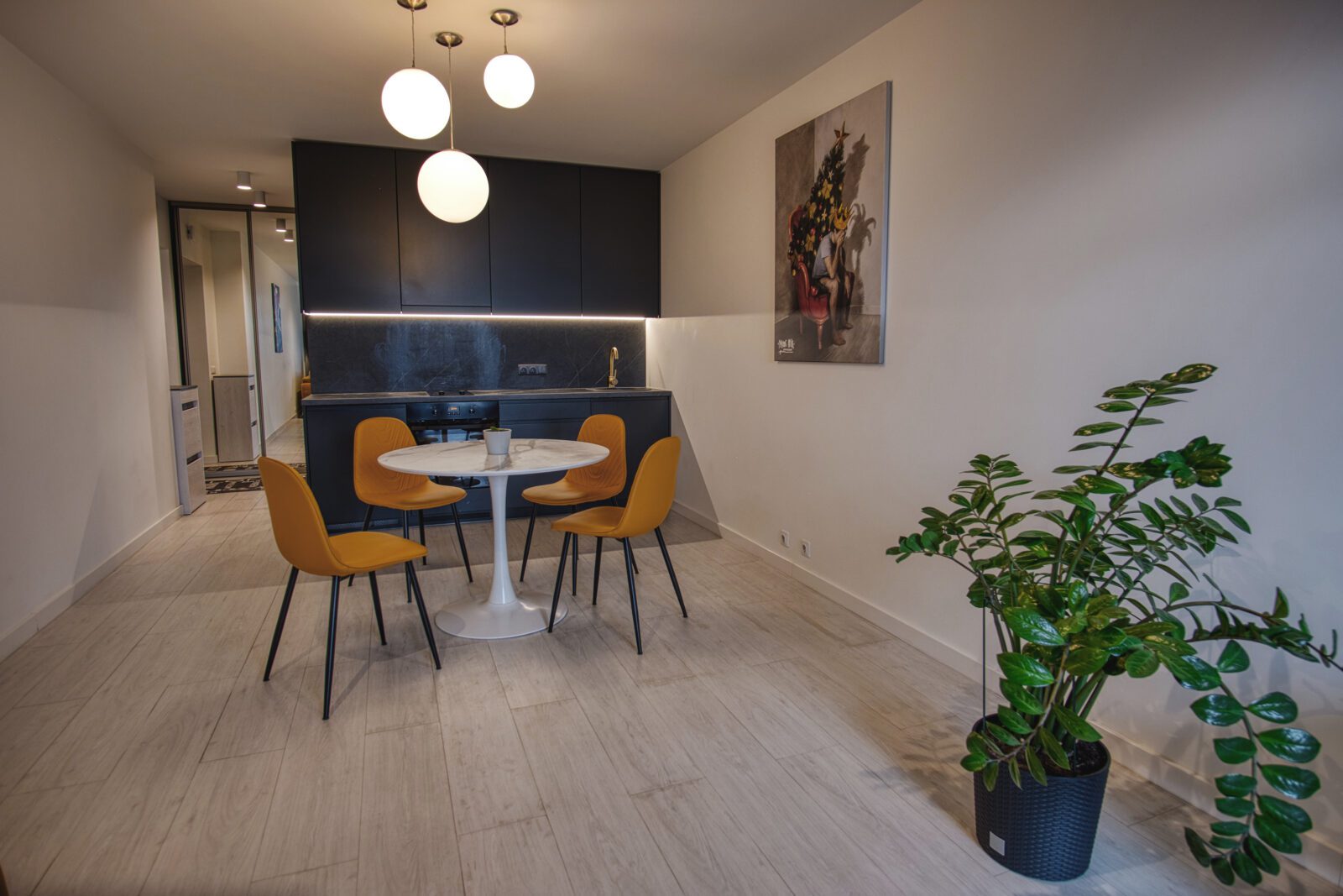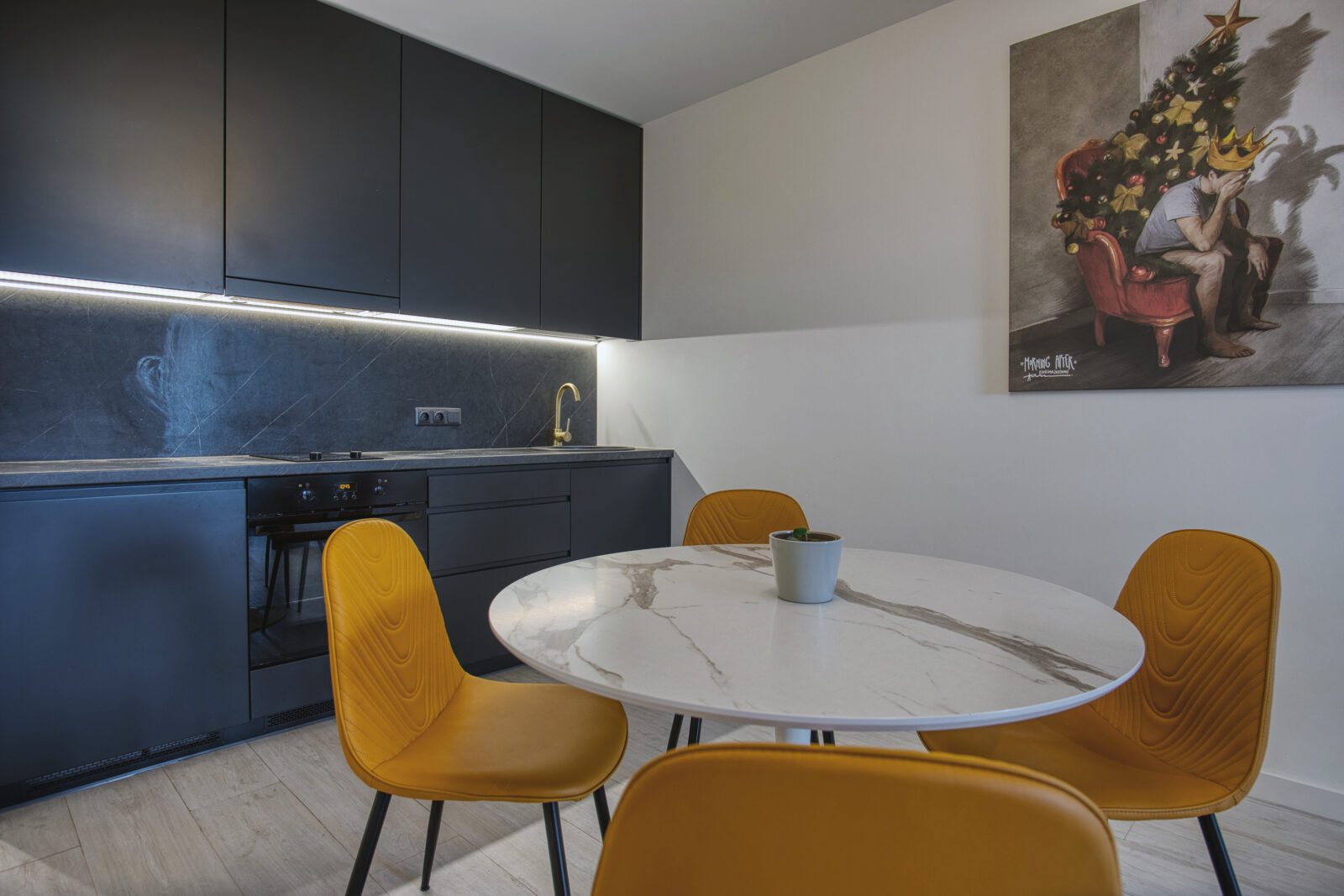 The black and white color scheme, with a touch of yellow, creates a visually striking and modern look in this minimalistic interior. The separation of white and black elements creates a sense of balance and harmony, while the pop of yellow adds a vibrant and energetic touch. This combination of minimalism, distorted perception, a black and white palette with hints of yellow creates a unique and captivating interior aesthetic.