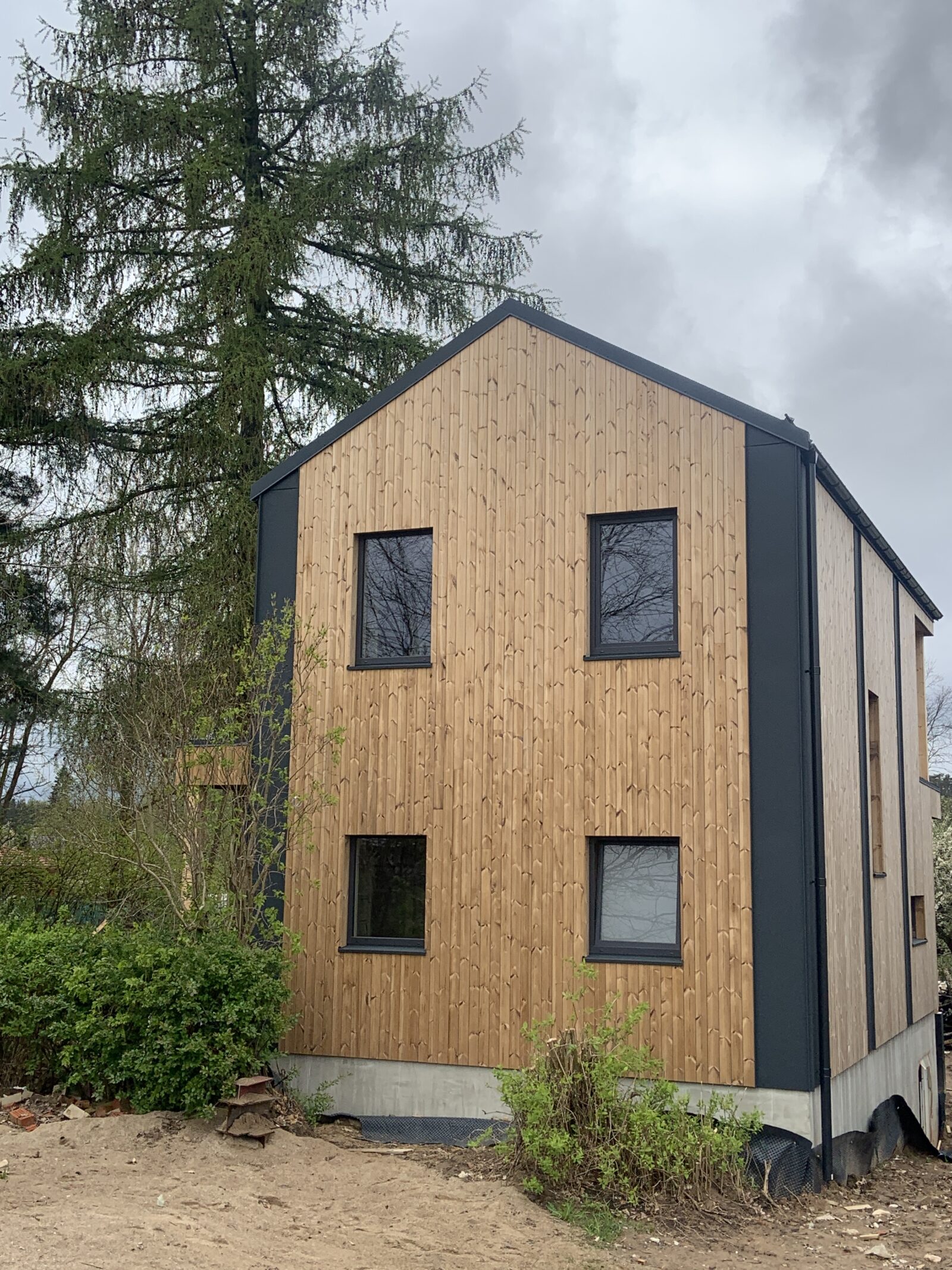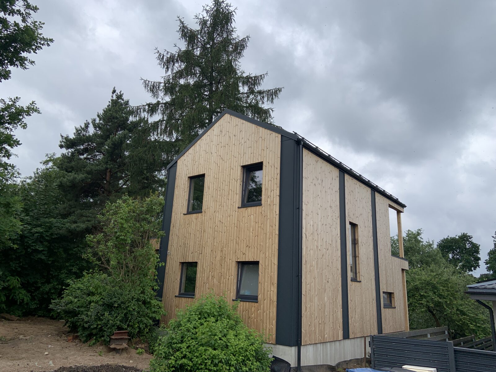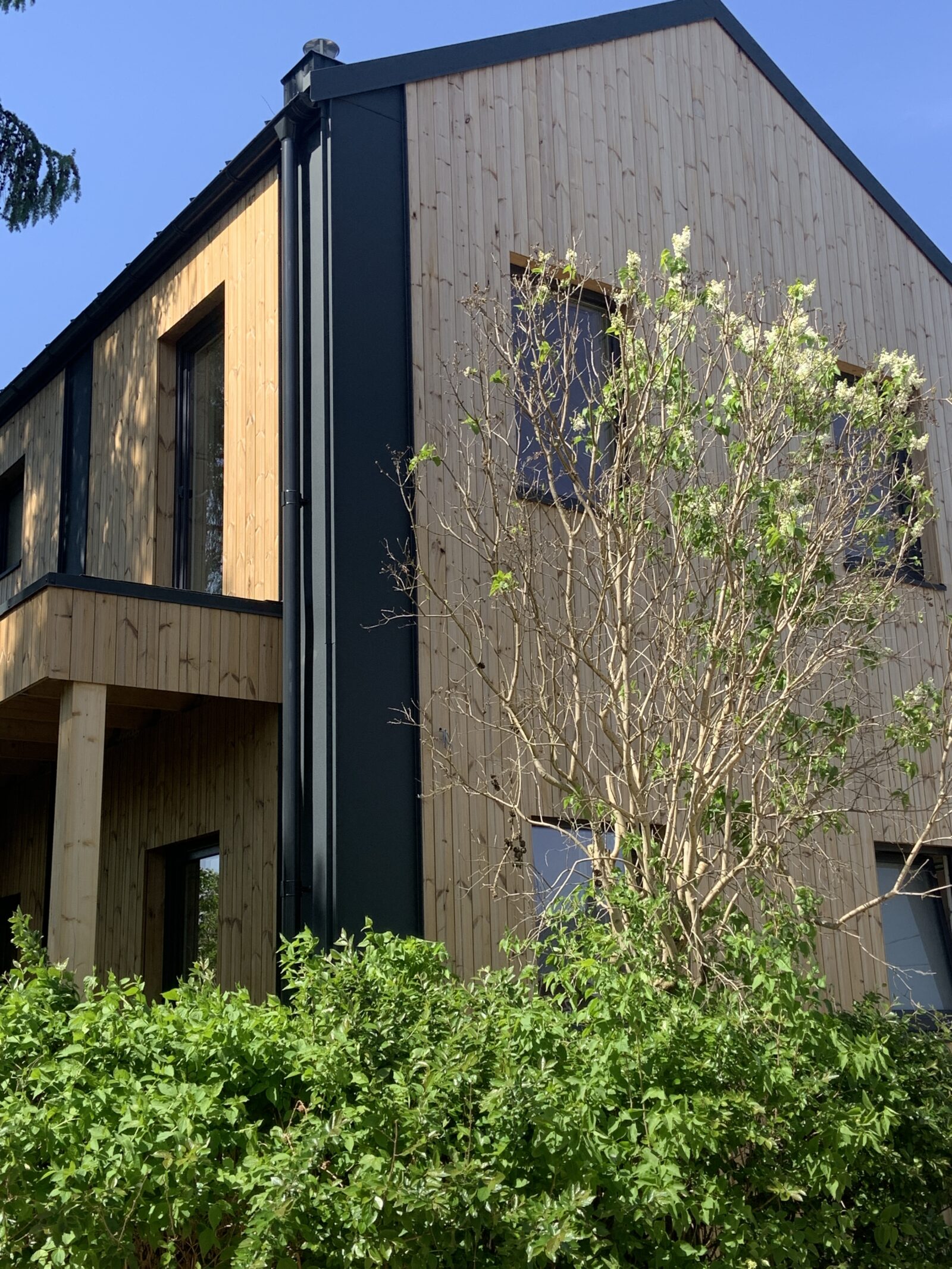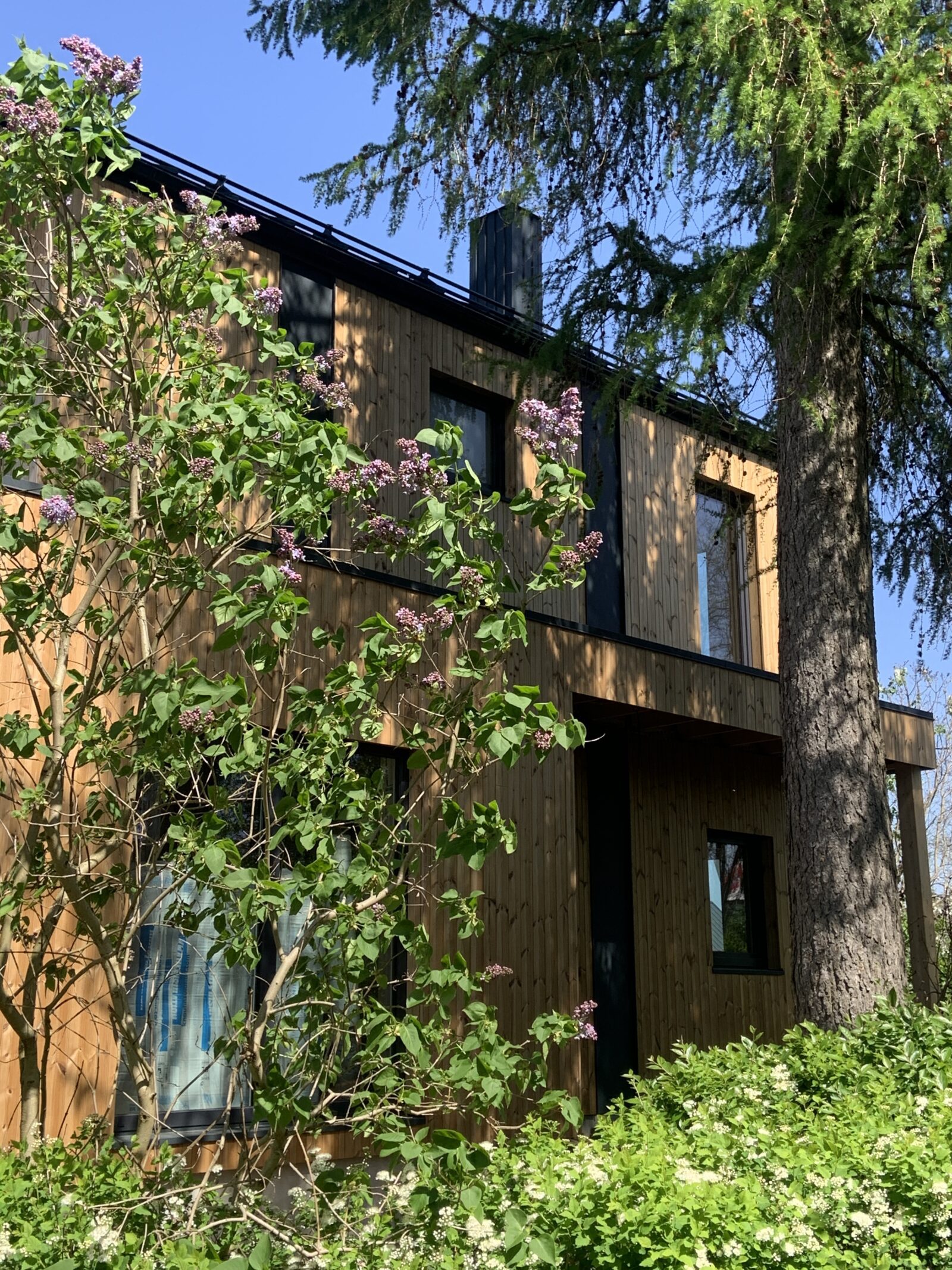 This contemporary home embraces a warm, natural aesthetic with its vertical wooden cladding, blending harmoniously into the surrounding greenery. The clean lines and simple rectangular form are softened by large windows that frame views of the garden and let in abundant natural light. Black window frames and subtle structural accents provide a refined contrast to the timber façade, while the building’s integration with mature trees creates a serene, secluded atmosphere. Combining modern design with the timeless appeal of natural materials, the house feels both stylish and deeply connected to its environment.